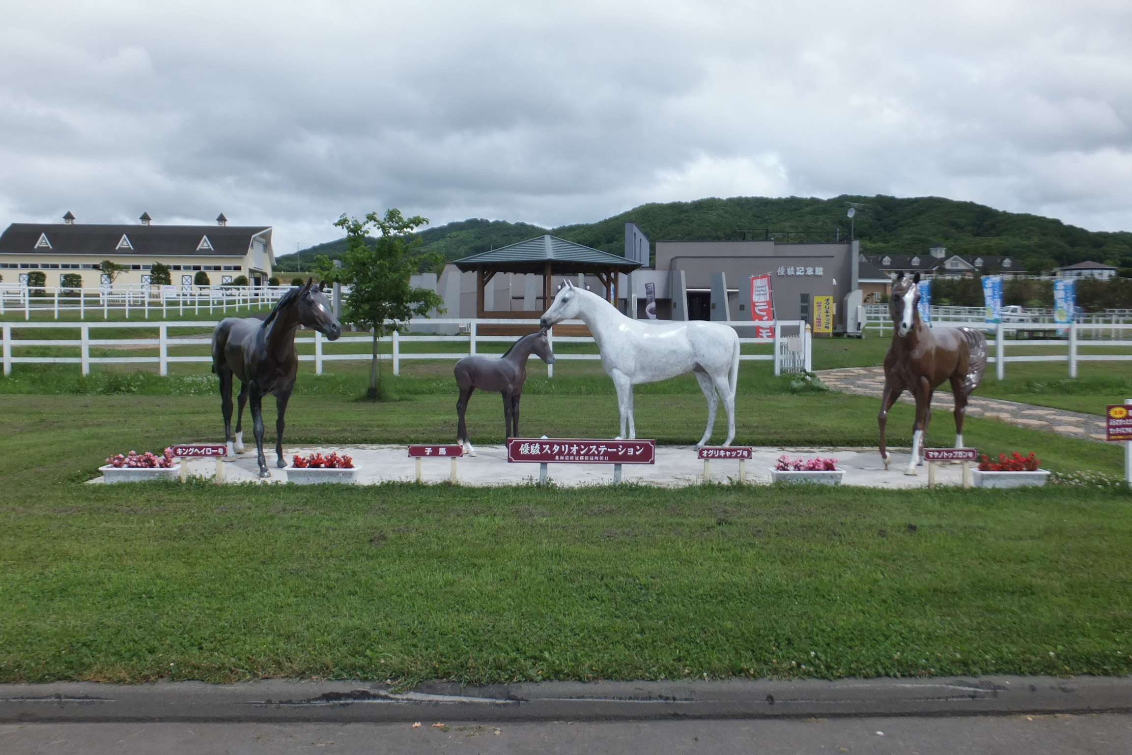 真歌の丘には、競走馬の放牧場が展開する。