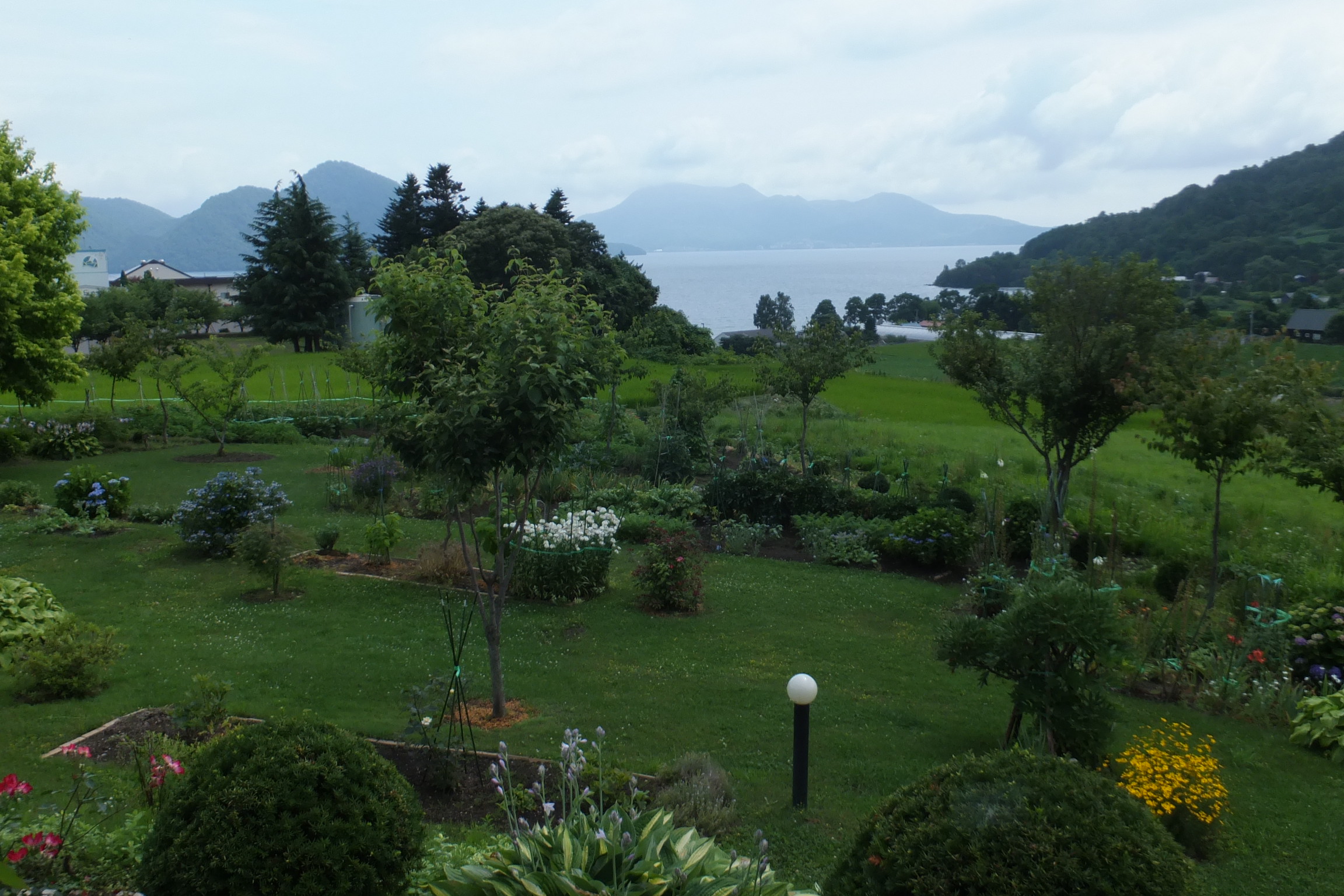 手入れが行き届いた庭は広く、前方には洞爺湖が。